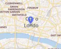 All Hallows Honey Lane was located at the north end of Honey Lane, a narrow lane leading north from Cheapside. The church was surrounded on three sides by churchyard and enclosed by private houses. It was situated about 200 feet (61 m) north of Cheapside.[1] John Stow's Survey of 1603 indicates the parish was part of Cheap Ward of the City of London.[2]