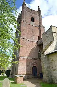 A new bell frame was placed in the Norman tower in 1642, two additional bells were added and the roof covered with 1,200 lbs of lead.[2] By 1657 there was sufficient concern about the stability of the Norman tower following this work that it was decided to bring it down and a new tower of four stages, detached from the church itself and modelled on the tower of St Matthews, Battersea, was built in its place in 1659.[4] This work, which cost £428,[3] took 32 men, 110,000 bricks and 62 loads of sand,[15] and the old church was connected to the new tower by two timber galleries, "as if part of a Shakespearean theatre".[5] The tower – a "proud tower", according to Betjeman[6] – has a number of arched doorways and windows, and is capped by four octagonal pinnacles on the belfry. The six bells in the tower date from 1616 and 1619 (Henry Knight; the second bell from 1619 has been recast); 1650 (uncredited); and two, including the tenor, 1788 (Robert Wells).[4] The clock in the north face of the tower was replaced in 1876 by one in the east face.[15]