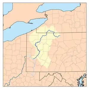 The river is approximately 325 miles (523 km) long, running through the U.S. states of New York and Pennsylvania.[10] It drains a rural dissected plateau of 11,580 square miles (30,000 km2) in the northern Allegheny Plateau, providing the northeasternmost drainage in the watershed of the Mississippi River. Its tributaries reach to within 8 miles (13 km) of Lake Erie in southwestern New York.