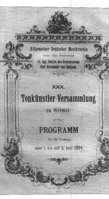 At the Tonkünstler-Versammlung (Musicians Assembly) of 1859 in Leipzig, the organisers, Liszt and Brendel, wanted to open the path for the foundation of a "Allgemeiner Deutscher Musikverein" (General German Music Association), to embody what they thought of as the core principles of the New German School (q.v.) of music. The proposal was introduced by Louis Köhler on the afternoon of 3 June 1861. It was supported in speeches by prominent persons, among them Liszt, and then accepted.[1] On 7 August 1861, at the next Tonkünstler-Versammlung, for this time in Weimar, the foundation of the ADMV took place. The association started with 202 members, 37 of them from abroad.[2]