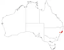 The species is distributed between Raymond Terrace and Port Macquarie and has been recorded at 32 sites within six general localities over a geographic range of approximately 40 kilometres (25 mi).[1]
