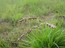 Alloteropsis semialata, known commonly as black seed grass, cockatoo grass, donkersaad gras, swartsaadgras, tweevingergras, and isi quinti, is a perennial grass distributed across much of tropical and subtropical Africa, Asia and Australia, as well as Papuasia and Madagascar.[1][2][3] The genus name Allopteropsis comes from the Greek words "allotrios", meaning "belonging to another", and "opsis", meaning appearance. The specific epithet semialata comes from the Latin "semi" (half) and "ala" (wing), referring to the winged margins of the upper glume.[4]