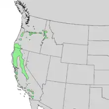 Alnus rhombifolia, the white alder, is an alder tree native to western North America, from British Columbia and Washington east to western Montana, southeast to the Sierra Nevada, and south through the Peninsular Ranges and Colorado Desert oases in Southern California.[2] It occurs in riparian zone habitats at an altitudes range of 100–2,400 metres (330–7,870 ft).[3][4] While not reported in northern Baja California, it has been predicted on the basis of its climatic adaptation to occur there also.[3] Alnus rhombifolia is primarily found in the chaparral and woodlands, montane, and temperate forests ecoregions.[2]