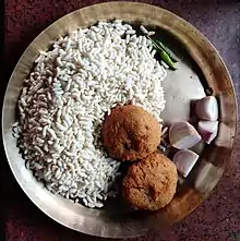 Aloo Chop (Bengali: আলুর চপ, Odia: ଆଳୁ ଚପ)[1] a snack originating from the Indian subcontinent made out of boiled potatoes and various spices. It is available widely in the Indian states of Odisha and West Bengal, and in Bangladesh. "Aloo" means potato, and the word "chop" means a small cutlet fritters or croquette in Bengali. It is served hot and warm along with muri (puffed rice), green chilies, and sometimes sauce and salads. It is a vegetarian alternative, and an equivalent of aloo tikki.[2]