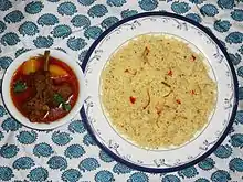 Aloo gosht (Urdu: آلو گوشت, Bengali: আলু গোশ্ত Alu göshto, Assamese: আলু গোছ Alu güs) is a meat curry, originating from the Indian subcontinent, and popular in North Indian, Pakistani, and Bangladeshi cuisine. It consists of potatoes (aloo) cooked with meat (gosht), usually lamb or mutton or beef, in a stew-like shorba gravy.[1][2] It may be considered a curry, stew, or shorba depending on the way the dish is prepared, the types of spices used and what country or particular region it was made in. The dish can be served and eaten with plain rice or with bread such as roti, paratha or naan.