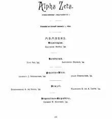 Alpha Zeta was founded at Cornell University on January 1, 1890.[1] In the fall of 1889, international Latin American students decided to establish a fraternity that would cater to their needs. Since travelling was more of a challenge in 1889–1890, during the winter break, the organization's founders stayed in Ithaca, New York. On New Year's Day in 1890, at a meeting on campus, the founders created the first Latin American student fraternity in the United States.[2]