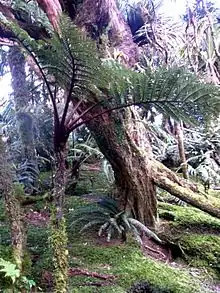 Alsophila brevipinna, synonym Cyathea brevipinna,[1] is a species of tree fern endemic to the higher parts of Mount Gower (875 m) on Lord Howe Island, where it grows in exposed areas at an altitude of about 790 m. The trunk is erect and may reach 3 m in height. It is often covered with reddish brown scales and stipe bases. This species may produce stolons at ground level. Fronds are tripinnate, densely crowded, and up to about 3 m long. The stipe is brown and sometimes warty after scales fall off. The scales are long, glossy dark brown, with a distinctly narrow apex and fragile paler edges. Sori are attached to deeply divided fertile pinnules that may uncurl over the sori. Indusia are firm and large. A. brevipinna is a stunted plant with short pinnae.[2]