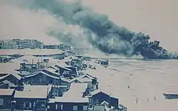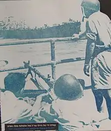 The Altalena was shadowed by navy corvettes on its way to Tel Aviv. As the ship neared the coastline, the corvettes began firing at it with bursts of machine-gun fire, and stopped after fighters on board the Altalena answered with Bren guns mounted on the deck. The Altalena arrived at midnight, running aground on the busiest stretch of shore, at the foot of David Frischmann Street, in view of locals, journalists, and UN observers watching from the terrace of the Kaete Dan Hotel (today Dan Tel Aviv). In response, Ben-Gurion ordered Yigael Yadin (acting chief of staff) to concentrate large forces on the Tel Aviv beach and to take the ship by force. He also indicated to his interior minister that he would order the Israeli Navy to intercept any attempt by the Altalena to retreat into international waters. The IDF transferred heavy guns to the area and at four in the afternoon the next day, Ben-Gurion ordered the shelling of the Altalena. The first gunner ordered to fire on the ship, a Red Army veteran named Yosef Aksen, refused, saying he was willing to be executed for insubordination and this would be "the best thing he did in his life." Hillel Daleski, a recent immigrant from South Africa, at first protested, and told Shmuel Admon, the commander of the IDF Artillery Corps, that "I didn't come to the Land of Israel to fight against Jews", but relented after being threatened with a court-martial.[10][12] Yitzhak Rabin commanded the IDF and Palmach forces on the shore. One of the shells hit the ship, and it began to burn. Yigal Allon later claimed five or six shells were fired as warning shots and the ship was hit by accident.[5][13] IDF troops on the shore also directed heavy small-arms fire towards the ship, and employed heavy machine guns with armor-piercing rounds. Some soldiers refused to open fire on the Altalena, including a Palmach soldier whose brother, an Irgun officer, was on the ship.[14] Menachem Begin, hoping to avert civil war, ordered his men not to shoot back, and the ship raised the white flag. However, the firing continued, and some Irgun men on board reportedly returned fire. The Israeli corvettes also fired at the Altalena during the battle, and one crewman later claimed that IDF troops on the beach were hit by fire from one of the corvettes, which had aimed at the Altalena but overshot its target.[15] On the beach, a battle between the IDF and Irgun forces along the shore erupted, and clashes between IDF and Irgun units also took place throughout Tel Aviv, mainly in the south and center.[16]