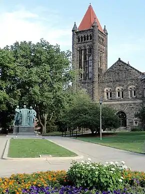 "Altgeld's castles" are buildings in the Gothic Revival style in five Illinois universities, all built at the initiative or inspiration of Illinois Governor John Peter Altgeld.[1] During his term as governor, Altgeld expressed certain opinions on how buildings should be erected in the state of Illinois. In his second biennial message to the state legislature, he discussed how buildings were being constructed without consideration for their outward appearance. He stated that it was time for buildings to become more aesthetically pleasing in addition to being functional, and he suggested the "Tudor-Gothic style" as the most inexpensive way to do this. Consequently, several of the state universities in Illinois erected buildings which resembled castles in his honor.[2] College folklore states that these buildings have aligned corridors and rooms so that they could all be "put together" to create one large building, but there is no evidence to support this rumor.