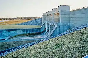 Alum Creek Dam was constructed between 1970 and 1974 on Alum Creek, a tributary of Big Walnut Creek, which drains into the Scioto River. The dam is a rolled earth-fill embankment 10,000 ft (3,000 m) in length with a maximum height of 93 ft (28 m). The spillway is located high on the right abutment with the raceway dropping off in front of it to the stilling basin below. Control is provided by three 34 ft (10 m) by 25 ft (7.6 m) tainter gates supported by 8 ft (2.4 m) wide concrete piers resting on concrete ogee sections. The ogee sections have a crest elevation of 878 feet (268 m) and are founded at 839 feet (256 m) elevation.