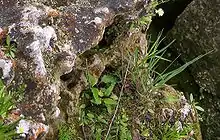 The primary cause of alvars is the shallow exposed bedrock. Flooding and drought, as noted, add to the stress of the site and prevent many species from growing.[1] Disturbance may also play a role. In Europe, grazing is frequent, while in North America, there is some evidence that fire may also prevent encroachment by forest.[4] The habitat also has strong competition gradients, with better competitors occupying the deeper soil and excluding other species to less productive locations.[5] Crevices in the limestone provide a distinctive habitat which is somewhat protected from grazing, and which may provide habitat for unusual ferns such as Pellaea atropurpurea. Bare rock flats provide areas with extremely low competition that serve as refugia for weak competitors such as the sandwort Minuartia michauxii and Micranthes virginiensis. In a representative set of four Ontario alvars, seven habitat types were described. From deep to shallow soil these were: tall grassy meadows, tall forb-rich meadows, low grassy meadows, low forb-rich meadows, dry grassland, rock margin grassland and bare rock flats.[6]
