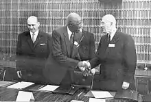 ![]() Lamine-Guèye (pictured centre) at a meeting of Assemblée parlementaire de la Francophonie in 1967 | |