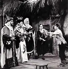 The BBC made several productions of Amahl and the Night Visitors in the 1950s. The first performance was broadcast on December 20, 1953, with Charles Vignoles as Amahl, and Gladys Whitred as his mother. The Three Kings were sung by John Lewis (Kaspar), Scott Joynt (Balthasar), and John Cameron (Melchior). Edric Connor was the Page and Josephine Gordon was the dancer. The opera was produced by Christian Simpson and the conductor was Stanford Robinson.[13] This performance was so successful that it was repeated on Christmas Eve 1954 with substantially the same cast apart from the Page sung by John Carvalho and the dancer, Betty Ferrier.[14] Both performances were broadcast live. A telerecording of the 1954 performance was broadcast on Christmas Eve 1956 but this recording seems to have been discarded. An audio recording of the 1954 performance exists in private hands.