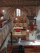 In 1958 the church underwent comprehensive restoration which revealed murals painted in medieval times and about 1600 which had been whitewashed over. Most could be recovered in subsequent years. The little altar before the organ was replaced in 1960 by a stone altar where the Gothic crucifix was placed. In 1981 the organ pipes were renewed, while the casing was preserved.