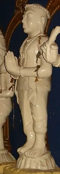 Amaraneedi Nayanar was born in Pazhayarai, the ancient capital of the Chola kingdom. He was a vaishya, member of the merchant caste. Amaraneedi was a trader of gold, jewels and clothes. Amaraneedi was a staunch devotee of Shiva, the patron god of Shaivism. He donated food and clothes to devotees of Shiva. He would especially gift Kowpeenam (loin-cloth) to Shaiva ascetics. Once, the merchant visited the Kalyanasundaresar Temple of Nallur (Tirunallur) dedicated to Shiva, to attend the temple festival. He worshipped at the Shiva temple and stayed at Nallur for a few days. One day, Shiva came to Amaraneedi's house disguised as a Brahmin Brahmachari (a celibate member of the priest caste). The young Brahmachari had matted hair and wore only a Kowpeenam. He was adored with the Tripundra (Shaiva marks on the forehead) and carried a staff with two Kowpeenams on it. The Brahmachari told Amaraneedi that he had come having heard of the merchant's generosity. Amaraneedi asked him for a chance to serve him, the Brahmachari lad consented and kept one of his dried Kowpeenams in the merchant's custody and left for a bath.[3][4]