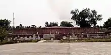 The main construction phases of Amaravati fall in two main periods, with the additions consisting of railings (vedikā) and carved slabs placed around the stūpa proper. These slabs are usually called 'drum slabs' because they were placed round the base of the stūpa which has a shape similar to a circular drum.[7] In the early period (circa 200-100 BCE), the stūpa had a simple railing consisting of granite pillars, with plain cross-bars, and coping stones. The coping stones with youths and animal reliefs, the early drum slabs, and some other early fragments belong to this period. The stūpa must have been fairly large at this time, considering the size of the granite pillars (some of which are still seen in situ, following excavations).