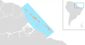 The Amazon Reef, or Amazonian Reef,[1] is an extensive coral and sponge reef system, located in the Atlantic Ocean off the coast of French Guiana and northern Brazil. It is one of the largest known reef systems in the world, with scientists estimating its length at over 1,000 kilometres (600 miles), and its area as over 9,300 km2 (3,600 sq mi). Publication of its discovery was released in April 2016, following an oceanographic study of the region in 2012. Evidence of a large structure near the delta of the Amazon River dated from as early as the 1950s.