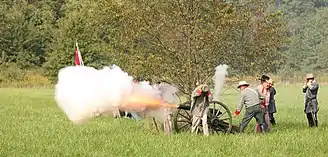 Some veterans have criticised military reenactment as glorifying 'what is literally a human tragedy.'[43] "‘If they knew what a war was like’, said one Second World War combat veteran, ‘they’d never play at it’.[44] Further, some feminists have critiqued Civil War reenactment, arguing that it "builds up a prosthetic symbolic male white body, embedded in an archaic racialized gender system: the clothing and the tools normally intensify male whiteness. Thus, even if the outer appearance of the uniformed female reenactor is flawless, her participation is deemed unacceptable by most male reenactors."[45] Some reenactments more recently have allowed women to participate as combatants as long as their appearance can pass as male from a specified distance, or if they are representing a specific historical woman who fought in the Civil War while cross-dressing as a man. Other units have allowed women to participate unconditionally.[19]