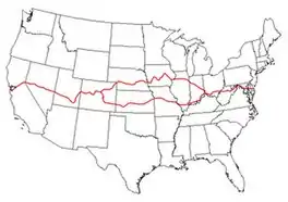 The American Discovery Trail is a system of recreational trails and roads which collectively form a coast-to-coast hiking and biking trail across the mid-tier of the United States. Horses can also be ridden on most of this trail.[1] The coastal trailheads are the Delmarva Peninsula on the Atlantic Ocean and the northern California coast on the Pacific Ocean. The trail has northern and southern alternates for part of its distance, passing through Chicago and St. Louis respectively. The total length of the trail including both the north and south routes is 6,800 miles (10,944 km). The northern route covers 4,834 miles (7,780 km) with the southern route covering 5,057 miles (8,138 km). It is the only non-motorized coast-to-coast trail.[2]