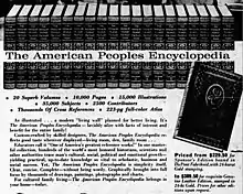 The Chairman of the American Peoples Encyclopedia Editorial Board was Walter Dill Scott, President Emeritus of Northwestern University.[3] The Editor-in-Chief was Franklin J. Meine.[4] Sears Roebuck and Company conducted a national advertising campaign that supported both its retail store and its mail-order catalog encyclopedia sales. The company's group manager for American Peoples Encyclopedia sales was A.T. Cashman.[5]