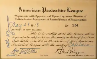 Under this directive, the APL worked with the Bureau of Investigation (BOI) — precursor to the FBI — which gathered information for U.S. District Attorneys.[4] APL assistance was welcomed by the BOI, which in 1915 had only 219 field agents, without direct statutory authorization to carry weapons or to make general arrests.[4] Thus the author of a letter to the New York Times claimed membership in the APL and described it as "a volunteer unpaid auxiliary of the Department of Justice" in which he and his colleagues "have been acting upon cases assigned by the Department of Justice, Military Intelligence, State Department, Civil Service, Provost Marshal General, etc."[5]
