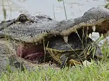 Occasionally, domestic animals, including dogs, cats, and calves, are taken as available, but are secondary to wild and feral prey.[25] Other prey, including snakes, lizards, and various invertebrates, are eaten occasionally by adults.[23] Water birds, such as herons and egrets, storks, waterfowl and large dabbling rails such as gallinules or coots, are taken when possible. Occasionally, unwary adult birds are grabbed and eaten by American alligators, but most predation on bird species occurs with unsteady fledgling birds in late summer, as fledgling birds attempt to make their first flights near the water's edge.[23]
