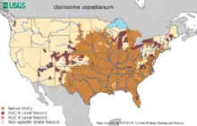 They have historically ranged from North Dakota in the northwest of the United States south to New Mexico in the southwest, east to Florida in the southeast, and north to 40°N latitude (they have historically been seen no farther north than the lower New York Harbor).[1] They were not seen in many of the Great Lakes until the late 1800s and early 1900s, although they are suspected to be native to Lake Erie, reaching it after the last ice age.[2] Gizzard shad typically live in lakes and reservoirs, although they can live in rivers and streams, and brackish waters. They reside in the limnetic zone, and can comprise up to 80% of fish biomass in certain lake systems. They prefer shallow lakes with muddy bottoms and relatively high turbidity.[5] This may be due in part to their breeding preferences, but it probably arises from because they have lower survival rates in clear waters and waters with high vegetative cover.[7]