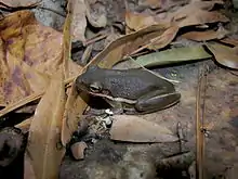 Males use a distinct advertisement call, "noticeably different than release or warning calls," to attract mates.[2] Once a mate has been attracted, the pair begins amplexus, in which "the male tightly grasps onto the female to bring their cloacal openings close together for fertilization."[2] Males are polygynous, generally seeking to mate with as many females as they can attract.[2] Eggs are attached to substrates such as emergent vegetation, and unlike many other frog species these egg masses are typically laid in permanent bodies of water rather than seasonal vernal pools.[5]