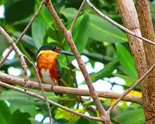 The American pygmy kingfisher (Chloroceryle aenea) is a resident breeding kingfisher which occurs in the American tropics from southern Mexico south through Central America to western Ecuador, and then around the northern Andes cordillera in the east to central Bolivia and central Brazil. The species occupies the entire Amazon basin and the Tocantins River drainage adjacent in Pará state Brazil. It also occurs on Trinidad.