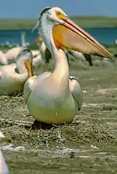 The American white pelican (Pelecanus erythrorhynchos) is a large aquatic soaring bird from the order Pelecaniformes. It breeds in interior North America, moving south and to the coasts, as far as Central America and South America, in winter.[2]