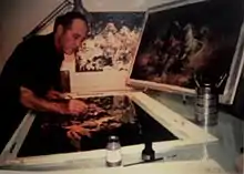 In 1987, the Makks entered into an agreement with Artcorp., a wholly owned subsidiary of Panz Corporation Ltd., a New Zealand conglomerate, for publication and distribution of the family's serigraphs.[58] In Summer 1988, the Makks opened their serigraphy studio Vision Fine Art Press where they produced the limited edition artwork.[59] The first serigraphs produced by the studio were Eva Makk's "Snowflakes" and Americo Makk's "Matching Strength."[59] The serigraphs of selected paintings were numbered and signed and were typically given runs of 100 to 275 editions.[60] The Makks were presented with awards from Screen Printing Association International (SPAI) in 1991 for "On Wings" by Eva Makk, 1992 for "High Camp" by Americo Makk, 1993 "Quartet" by Eva Makk, and 1994 "Rolling Clouds" and ""Silver with Gold" both by Americo Makk.[61] Vision Fine Art Press also represented notable artist Cliff Tanaka, winning an award for his serigraphy as well. Due to the high costs of production, serigraphy ended at the studio and reproductions went to giclee format.