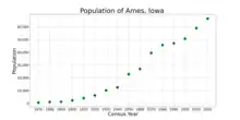 According to the 2020 census, Ames had a population of 66,427, making it the state's ninth largest city.[4] Iowa State University was home to 33,391 students as of fall 2019,[5] which make up approximately one half of the city's population.
