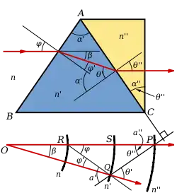 By 1860, Amici realized that one can join this type of prism back-to-back with a reflected copy of itself, producing a three-prism arrangement known as a double Amici prism.[1][2] This doubling of the original prism increases the angular dispersion of the assembly, and also has the useful property that the centre wavelength is refracted back into the direct line of the entrance beam. The exiting ray of the center wavelength is thus not only undeviated from the incident ray, but also experiences no translation (i.e. transverse displacement or offset) away from the incident ray's path.