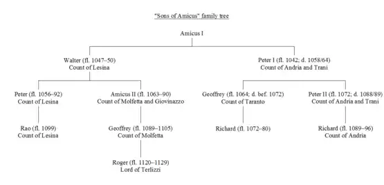 Amicus II belonged to a family known to modern scholars as the "sons of Amicus". His grandfather and namesake, Amicus I, lived in Normandy before 1030. Two of the latter's sons, Walter and Peter I, arrived in Italy before 1038. Walter was the father of Amicus II and Peter of Lesina. Amicus was thus the first cousin of Peter I's sons, Geoffrey of Taranto and Peter II of Trani.[1] The family was related—how is not known—to the Hauteville family.[2]