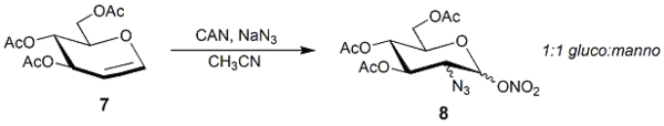 Glycals are cyclic enol ether derivatives of monosaccharides, having a double bond between carbon atoms 1 and 2 of the ring. N-functionalized of glycals at the C2 position, combined with glycosidic bond formation at C1 is a common strategy for the synthesis of amino sugars. This can be achieved using azides with subsequent reduction yielding the amino sugar.[1] One advantage of introducing azide moiety at C-2 lies in its non-participatory ability, which could serve as the basis of stereoseletive synthesis of 1.2-cis-glycosidic linkage.