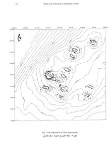 Amlah or ʿAmlāʾ (23°07′52″N 56°54′07″E), al-Dhāhirah province (41 km ESE of ʿIbrī), Sultanate of Oman. The area around Amlah contains numerous archaeological sites which came to light during surveys in the mid 1970s.[1] Those that are available to the public date from the Bronze Age Wadi Suq period to the late pre-Islamic period. 26 excavated graves provide evidence for a cemetery at al-Fuwaydah.[2] The graves and grave goods are related most closely to those of the United Arab Emirates, Preislamique Récente, i.e. PIR, and not the Samad Late Iron Age.[3] Among the most striking Late Iron Age finds are bronze phiales inscribed on the inside.[4]