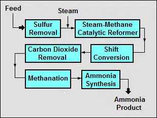 The steam reforming, shift conversion, carbon dioxide removal and methanation steps each operate at absolute pressures of about 25 to 35 bar, and the ammonia synthesis loop operates at absolute pressures ranging from 60 to 180 bar depending upon the particular method used.