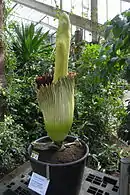 In May 2003, the tallest inflorescence in cultivation, some 3.20 m (10 ft 5 in) high (measured from its corm, 3.07 m from the soil surface), was grown at the Botanical Garden of the University of Bonn in Germany; this record was analyzed, photographed, and documented in detail.[19][20] The event was acknowledged by Guinness World Records.[21] The largest flower in the USA by Louis Ricciardiello, measured 3.10 m (10 ft 2 in) tall in 2010, when it was on display at Winnipesaukee Orchids in Gilford, New Hampshire, US. This event, too, was acknowledged by Guinness World Records.[22][23]