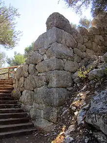 Further to the west, close to the ramparts, are the foundations of a small temple in antis with a pronaos, 6.8 m wide and 13.8 m long.[6] Inscriptions with a temple inventory found in the vicinity show that the temple was probably dedicated to Apollo Samnaios ("Apollo-of-the-hill"), a deity only known from this location.[1]
