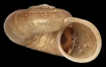 The shell is smooth, shining, not striate spirally, generally somewhat more depressed, deep chestnut or reddish brown. Whorls are a little flattened near the suture.[1] The species may have subtle spiral striation, although there exists considerable variation; axial growth lines are clearly visible.[2]