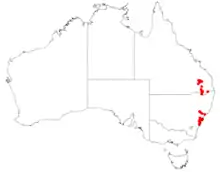 Amyema gaudichaudii only grows on melaleucas in forest and swamp woodland. It has been recorded on seven species of melaleuca, especially on M. decora and M. bracteata. It occurs in two disjunct populations in Queensland and New South Wales. In Queensland it is found in the western Darling Downs and in New South Wales in coastal areas between the Hunter and Illawarra districts.[2][3][4]