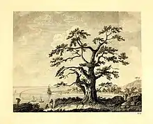 Some of the engravings in the Account were based on Parkinson's drawings, but this was not acknowledged;[26] Joseph Banks himself had written to Hawkesworth advising against it.[27] Some alterations were made; for example, Parkinson's original of Tree on One Tree Hill contains a seated figure of a person drawing as well as two Europeans; in the drawing by John James Barralet that was engraved for the Account, the seated figure has been erased and the Europeans have been replaced by Tahitians. It is possible that the seated figure depicts Parkinson himself and that he was removed at Banks' request.[28]
