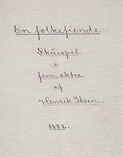 An Enemy of the People (original Norwegian title: En folkefiende), an 1882 play by Norwegian playwright Henrik Ibsen, followed his previous play, Ghosts, which criticized the hypocrisy of his society's moral code. Ibsen, Ellen Mortensen (Ibsen Studies v.7, 169) argues, wrote An Enemy of the People in response to the public outcry against Ghosts, which openly discussed adultery and syphilis. That response included accusations of both Ghosts and its author being "scandalous," "degenerate," and "immoral." In An Enemy of the People, a man dares to expose an unpalatable truth publicly and is punished for it.