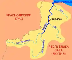 The Anabar (Russian: Анабар, tr. Anabar, in its upper course: Большая Куонамка Bolshaya Kuonamka; Yakut: Анаабыр, romanized: Anaabyr) is a river in Sakha, Russia. It is 380 kilometres (240 mi) long (939 km (583 mi) counting the 559 km (347 mi) long Bolshaya Kuonamka ("Big Kuonamka") stretch of its upper course) and has a drainage basin of 100,000 square kilometres (39,000 sq mi).[1]