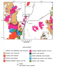 The Yerington mine produced 165 million tons of 0.6 per cent Cu between 1952 and 1978, from a porphyry copper deposit associated with the Middle Jurassic Yerington batholith. The 168-169 Ma batholith was emplaced in Late Triassic to Early Jurassic volcanic and sedimentary rocks. Late Tertiary normal faulting and tilting rotated the blocks 60°-90° westward so that stratigraphic tops are westward. Paleodepths from 0 to 8 km outcrop from the Pine Nut Mountains in the west to the northern Wassuk Range in the east.[8]
