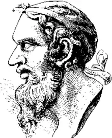 Anacreon had a reputation as a composer of hymns, as well as of those bacchanalian and amatory lyrics which are commonly associated with his name. Two short hymns to Artemis and Dionysus, consisting of eight and eleven lines respectively, stand first amongst his few undisputed remains, as printed by recent editors. But hymns, especially when addressed to such deities as Aphrodite, Eros and Dionysus, are not so very unlike what we call "Anacreontic" poetry as to make the contrast of style as great as the word might seem to imply. The tone of Anacreon's lyric effusions has probably led to an unjust estimate, by both ancients and moderns, of the poet's personal character. The "triple worship" of the Muses, Wine and Love, ascribed to him as his religion in an old Greek epigram,[7] may have been as purely professional in the two last cases as in the first, and his private character on such points was probably neither much better nor worse than that of his contemporaries. Athenaeus remarks acutely that he seems at least to have been sober when he wrote. His character was an issue, because, according to Pausanias, his statue on the Acropolis of Athens depicts him as drunk.[6] He himself strongly repudiates, as Horace does, the brutal characteristics of intoxication as fit only for barbarians and Scythians.[2][8]