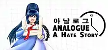 Analogue: A Hate Story (Korean: 아날로그: 어 헤이트 스토리) is a visual novel created by independent designer and visual novelist Christine Love. It was created with the Ren'Py engine, and was first released for download on the author's website in February 2012.[1] A sequel set centuries after Love's earlier work, Digital: A Love Story (2010), Analogue revolves around an unnamed investigator, who is tasked with discovering the reason for an interstellar ship's disappearance once it reappears after 600 years.[2] The game's themes focus similarly around human/computer interaction, interpersonal relationships, and LGBT issues;[3] but focus primarily on "transhumanism, traditional marriage, loneliness and cosplay."[4]