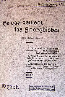 However Thonar continued his project of organizing anarchism. To clarify the positions, he drew up a manifesto, What anarchists want, which excluded from the outset those nostalgic for propaganda of the deed and the "originals" who were not conformist.[8]