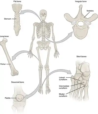 A short bone is one that is cube-like in shape, being approximately equal in length, width, and thickness. The only short bones in the human skeleton are in the carpals of the wrists and the tarsals of the ankles. Short bones provide stability and support as well as some limited motion.[1]