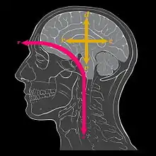 Standard anatomical planes and anatomical axes are used to describe structures in animals. In humans and many other primates the axis of the central nervous system is not straight, but bent to allow for forward vision when the body is vertical. This means that differences in terminology are needed to reflect the differences between the brains of primates and the brains of nearly all other vertebrates. For example, to describe the human brain, "rostral" still means "towards the beak or snout (Latin rostrum)", or at any rate, the interior of the cranial cavity just behind the face. "Caudal" means "towards the tail (Latin cauda"), but not "towards the back of the cranial cavity", which is "posterior" (behind, in ordinary motion). The rostro-caudal axis of the human central nervous system (magenta in the diagram) makes a near 90° bend at the level of the midbrain and continues through the brain-stem and spinal cord. In human anatomy, the occipital lobes and the back of the head are posterior but not caudal to the frontal lobes and the face.
